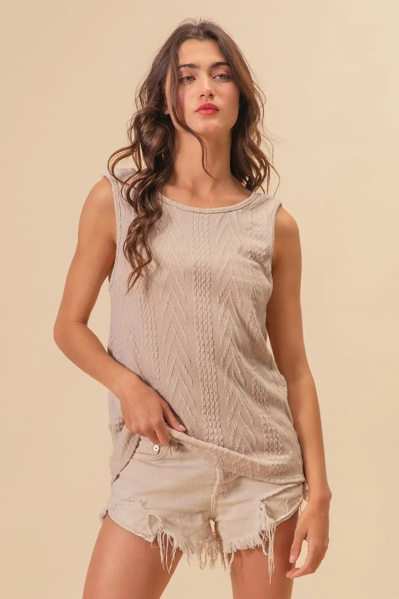 This sleeveless top features a textured sweater knit design with a twist back detail, adding a touch of sophistication and style to your outfit. The textured knit adds depth and visual interest to the top, while the twist back design creates a unique and eye-catching element. The sleeveless silhouette makes this top perfect for layering or wearing alone during transitional seasons. Made with high-quality materials, this top offers both comfort and a fashion-forward look. Elevate your wardrobe with this chic and versatile top that effortlessly combines texture and a twist back detail for a modern and stylish ensemble.