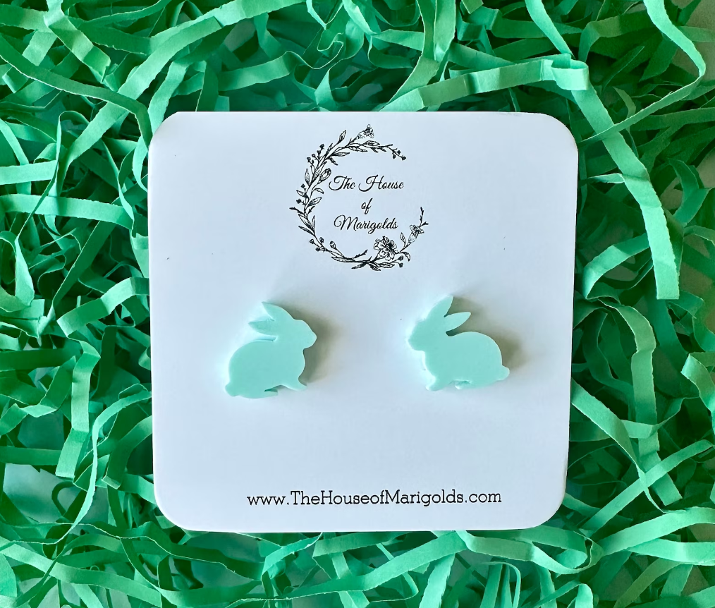 The cutest studs, shaped like bunnies and perfect for spring or Easter.  Choose between pastel teal or purple. Each earring has a stainless steel post.