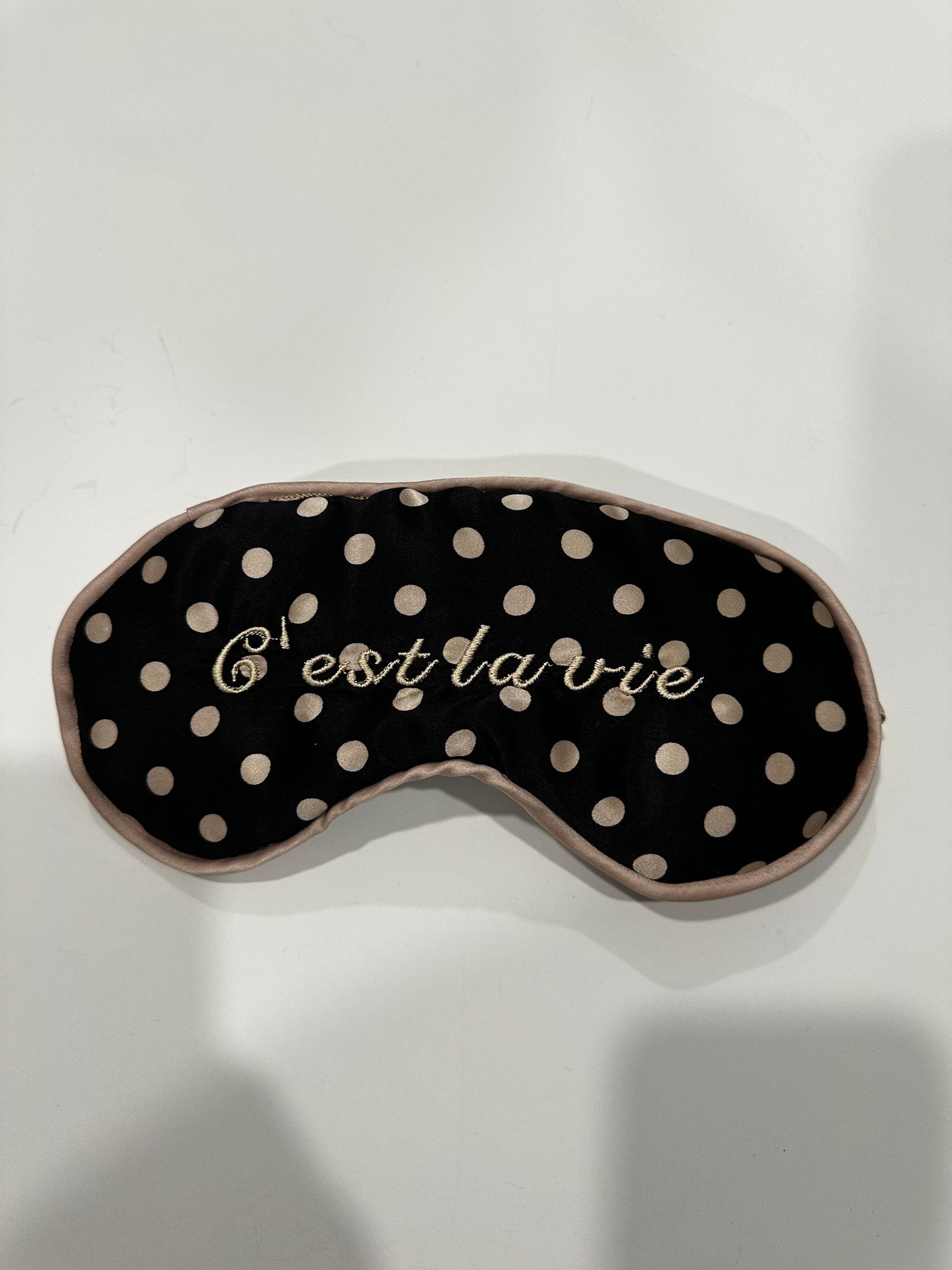Silk sleep mask with adjustable strap for the perfect fit and extra comfort to help get the most out of your beauty sleep. Sleep masks have comfort batting interior cushioning to keep the light out and have a blackout curtain sleeping experience anywhere anytime. Features embroidered artwork saying, "C'est la vie" to add some fun to your longest travel days. Perfect for long flights, bright hotel rooms, and more. This sleep mask was designed and handmade by 9th Ave Designs.