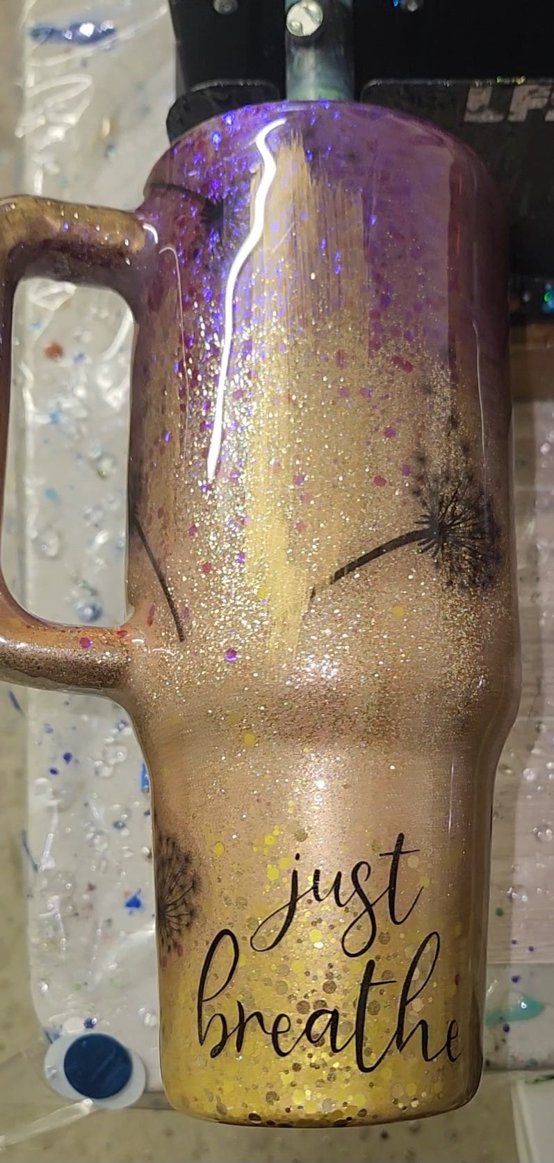 This 40 oz. stainless steel tumbler with handle was handcrafted in layers using paint, glitter, alcohol ink, decals, and premium epoxy resin.