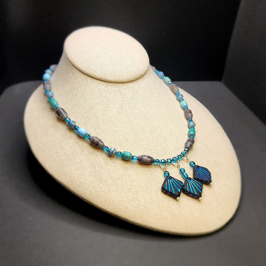 Lady with a Fan Paper Bead Necklace - 17" with 2" chain extender