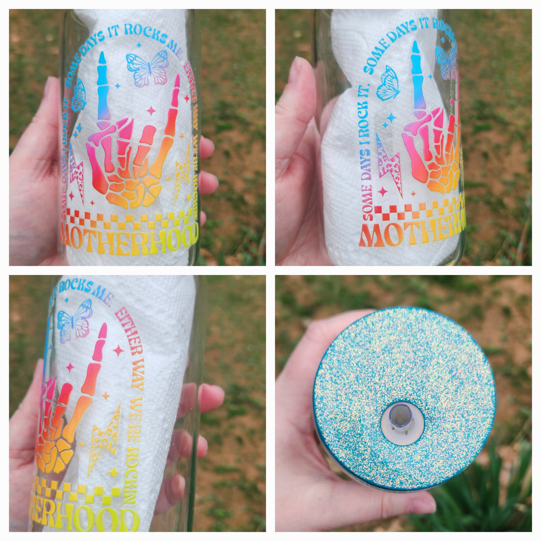 This 16 oz. glass can tumbler hand decorated with a permanent UV DTF decal. Comes with a bamboo lid hand decorated with paint, glitter, and UV resin, a straw, and care card.