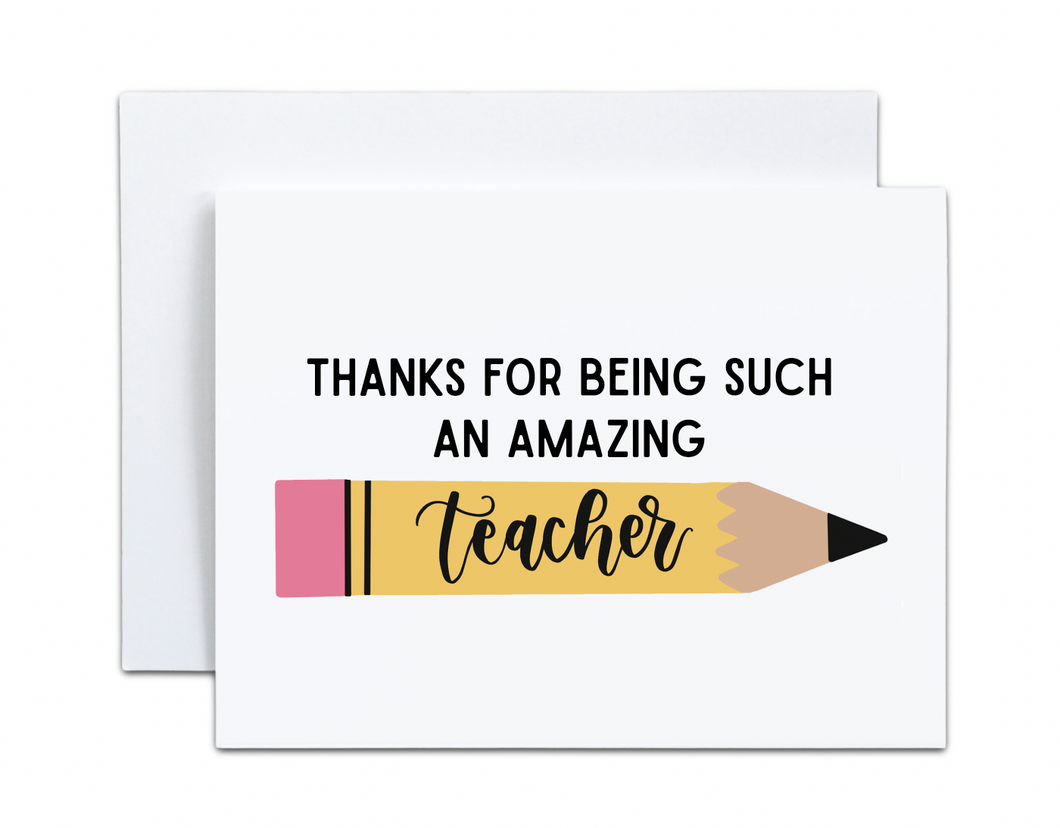 Show a teacher how much you appreciate them! This card reads "Thanks for being such an amazing teacher" and features a drawing of a pencil. The inside is blank so you can add your own personal message. This card is perfect for teacher appreciation week or as an end of the year gift!