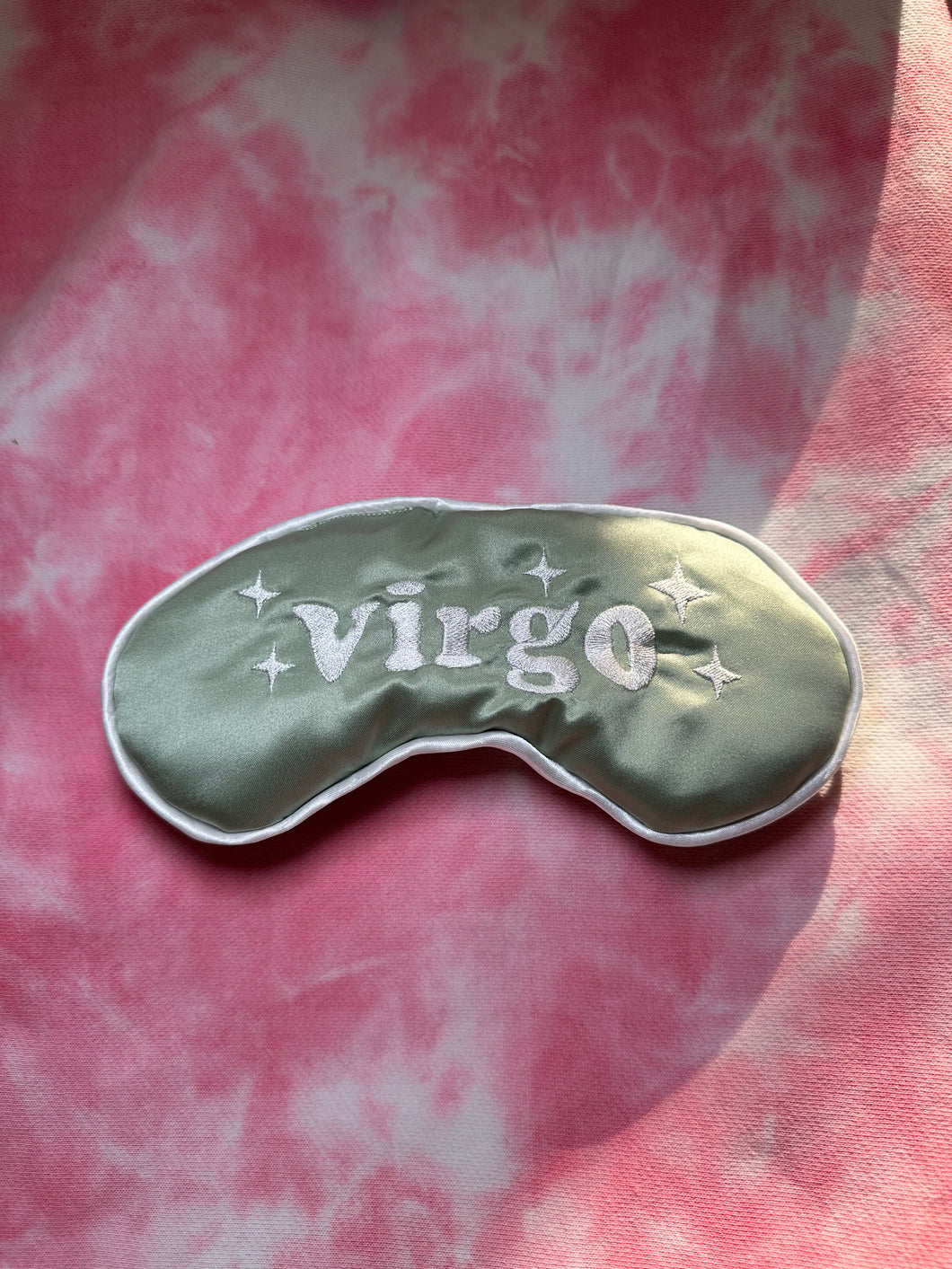 Satin sleep mask with adjustable strap for the perfect fit and extra comfort to help get the most out of your beauty sleep. Sleep masks have comfort batting interior cushioning to keep the light out and have a blackout curtain sleeping experience anywhere anytime. Features embroidered artwork saying, "Virgo" to add some fun to your longest travel days. Perfect for long flights, bright hotel rooms, and more. This sleep mask was designed and handmade by 9th Ave Designs.