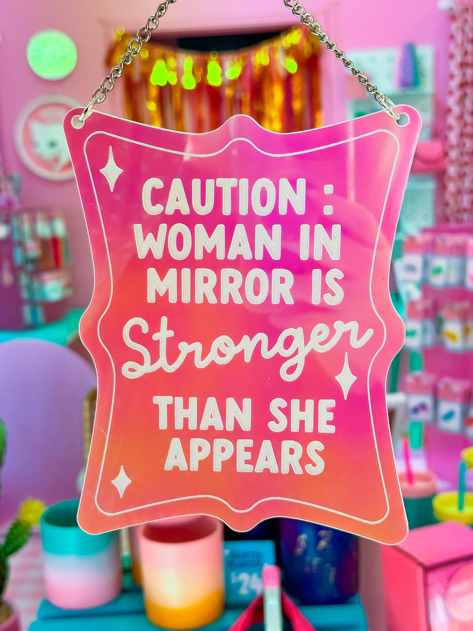 Woman in Mirror is Stronger Than She Appears / Engraved Mirror: Pink-Tinted Iridescent Acrylic
